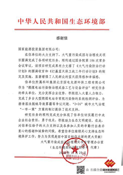 2020年12月29日,龍源環保承擔國家“總理基金”項目子課題,獲生態環境部致函感謝