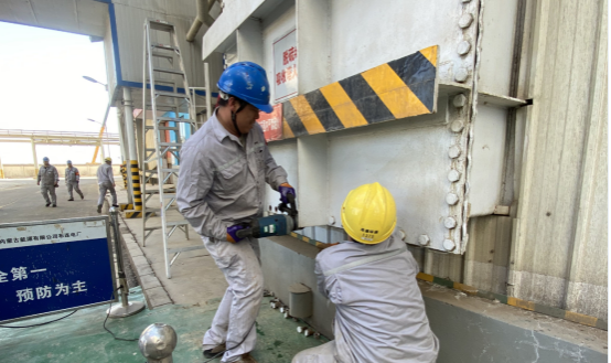 在脫硫2號吸收塔0米處,工作人員正在拆除脫硫2號吸收塔0米的人孔門螺栓,他們用電動扳手代替了以往的機械扳手,大大提高了機組檢修效率。